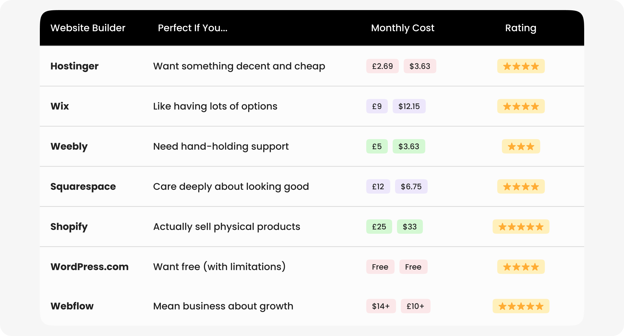 L’amico di tuo cugino che “sa di computer” potrebbe dirti di usare WordPress solo perché è popolare. Il tuo business coach potrebbe spingerti verso il miglior website builder per blog. Ma la verità è questa: ciò che funziona per l’attività di qualcun altro potrebbe essere completamente sbagliato per la tua.